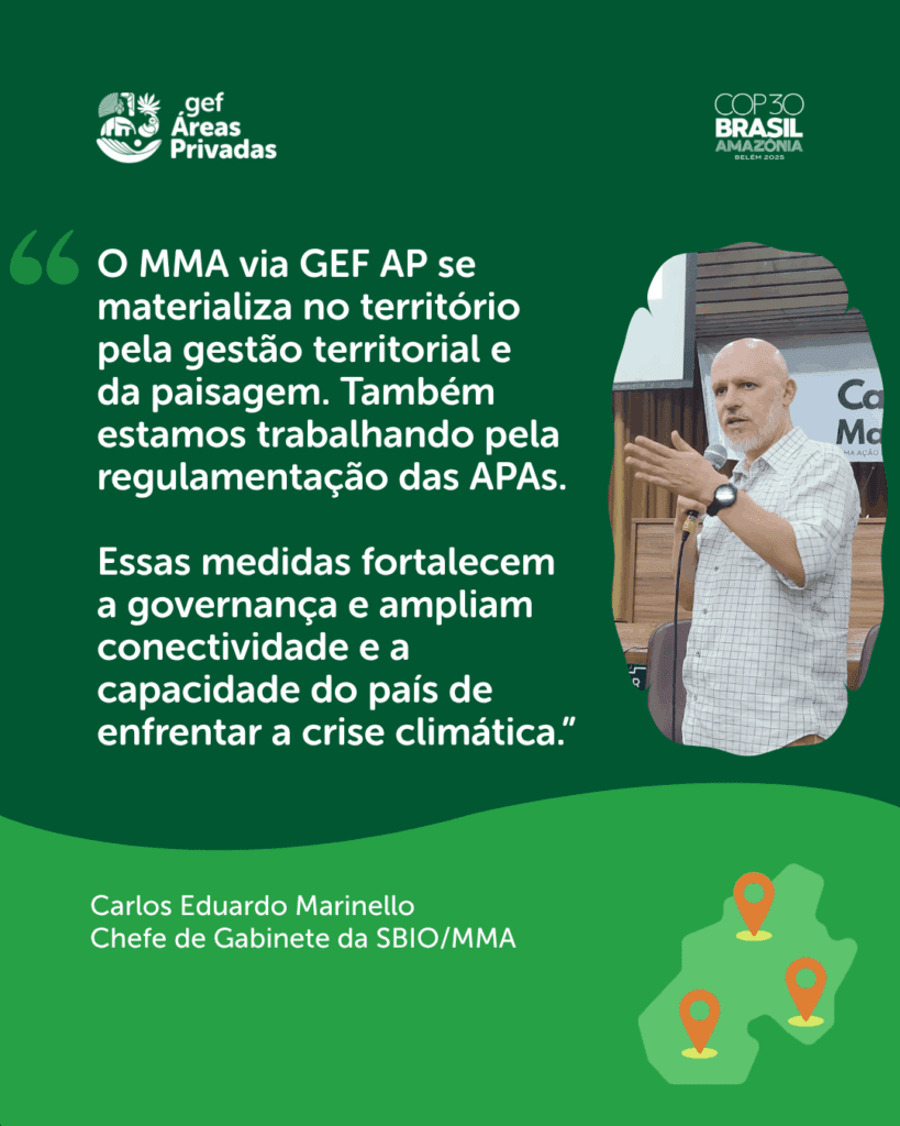 O chefe de gabinete da Secretaria Nacional de Biodiversidade, Florestas e Direitos Animais do Ministério do Meio Ambiente e Mudança do Clima (MMA), Carlos Eduardo Marinello, destacou que ações desenvolvidas pelo GEF AP se articulam com instrumentos da agenda nacional, como o Programa Nacional de Conectividade de Paisagens, a Estratégia e Plano de Ação Nacionais para a Biodiversidade (EPANB), o Plano Clima e o Pacto de Sinergias entre as Convenções do Rio.