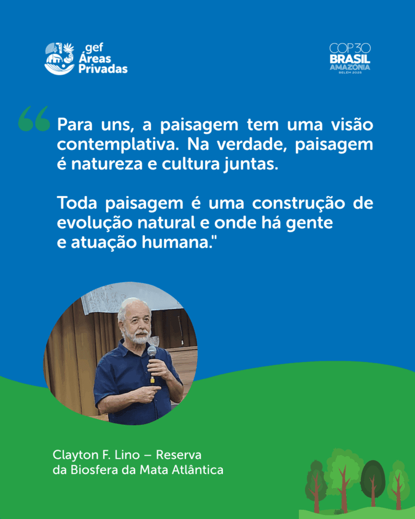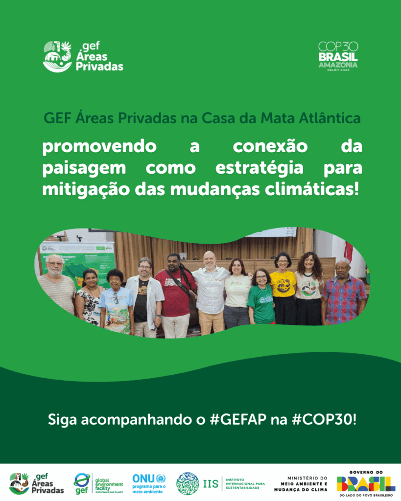 A integração entre conservação da biodiversidade, clima e gestão integrada da paisagem orientou o debate da mesa “Conexão da paisagem como estratégia para mitigação das mudanças climáticas”, realizada na Casa da Mata Atlântica, em Belém (PA), dia 13 de novembro, durante a COP30. O Projeto GEF Áreas Privadas (GEF AP) foi apresentado como um exemplo concreto de como iniciativas em áreas privadas podem contribuir para formulação de políticas públicas, restauração ecológica e conectividade de paisagens em biomas estratégicos.